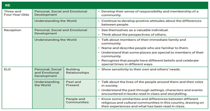 In Early years, we select the Early Learning Goals that link most closely to RE curriculum guidance.